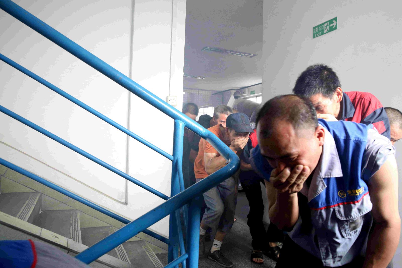 抽查結束后,組織參與員工到辦公室二樓集中,由演習器材準備組在辦公室一樓通道點燃了濃濃煙霧,安全生產負責人李福章急促不斷地吹著哨子,56名員工按照演練的要求彎著腰捂著鼻子有序地從二樓奔向一樓,在滾滾的濃濃的煙霧中演練著逃生。