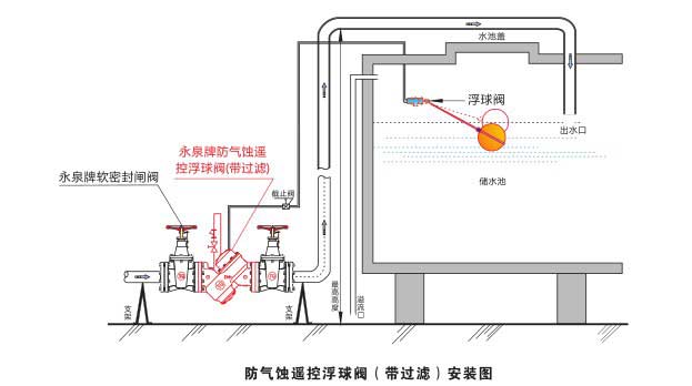 防氣蝕遙控浮球閥(帶過濾)由一個帶過濾活塞式主閥和一個浮球閥兩部分組成,通過浮球閥的啟閉來控制主閥的啟閉,浮球閥開啟時,主閥開啟,浮球閥關閉時,主閥也關閉。浮球閥的啟閉則通過浮球所受到的浮力和重力等作用實現,當儲水池水位達到設定高度時,浮球浮起,浮球閥關閉,當儲水池水位降低時,浮球隨著降落,浮球閥開啟。