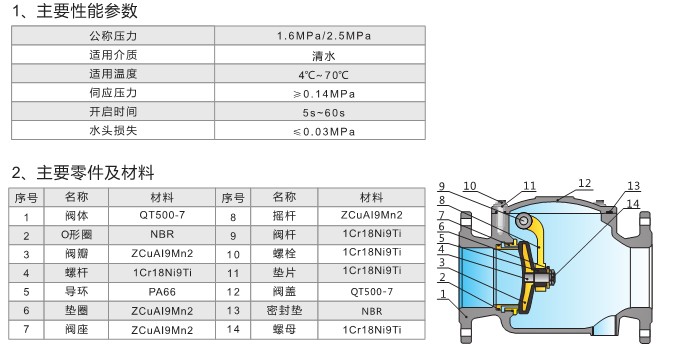 B.閥體、閥蓋用優質的球墨鑄鐵制造,其內外表面靜電噴涂環氧樹脂,閥瓣組件由黃銅全包膠制造,確保本閥在長期處于伺應狀態下,也不會產生銹蝕和卡死現象。