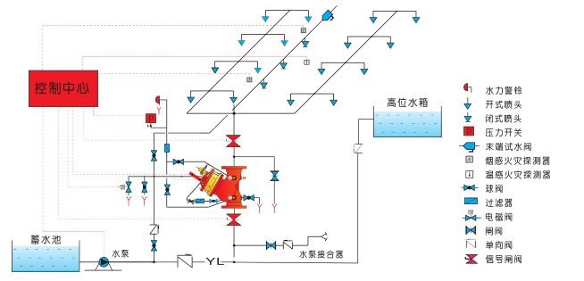 一旦發生火災,無論采用電動控制、傳動管控制、手動控制的任一種控制方式,主閥將立即開啟,并啟動消防水泵,為系統的開式噴頭提供足夠的水源,有效地撲滅火災。