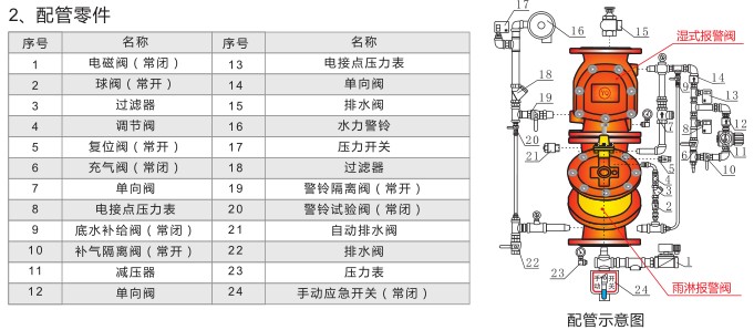 定義:預作用裝置是專門為消防系統而設計的閥門組合。主要由雨淋閥和濕式閥上下串接而成,通過電動、機械或其他方法和閉式噴頭開啟,使水能夠自動單向流入噴水系統滅火同時進行報警的一種控制閥組。