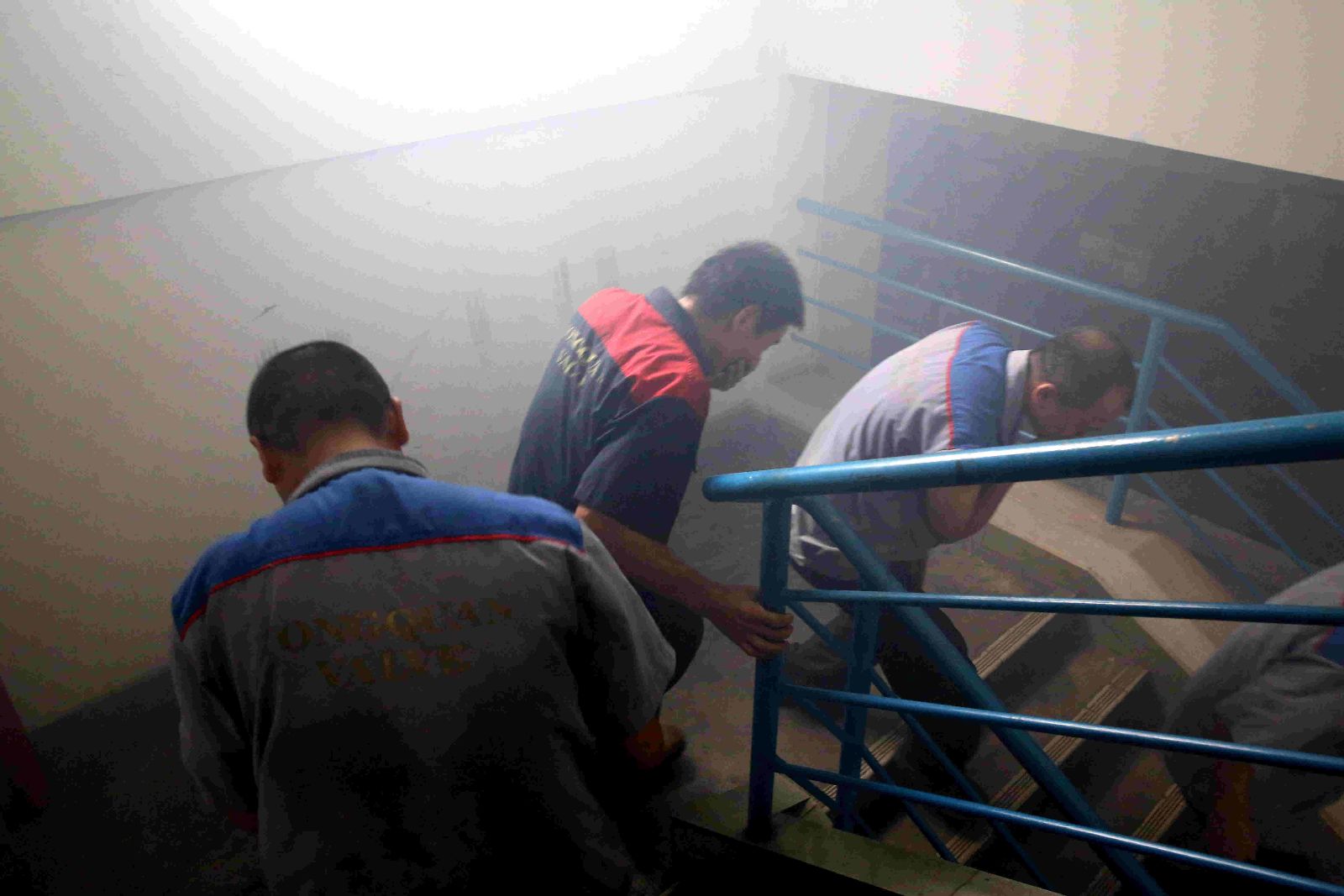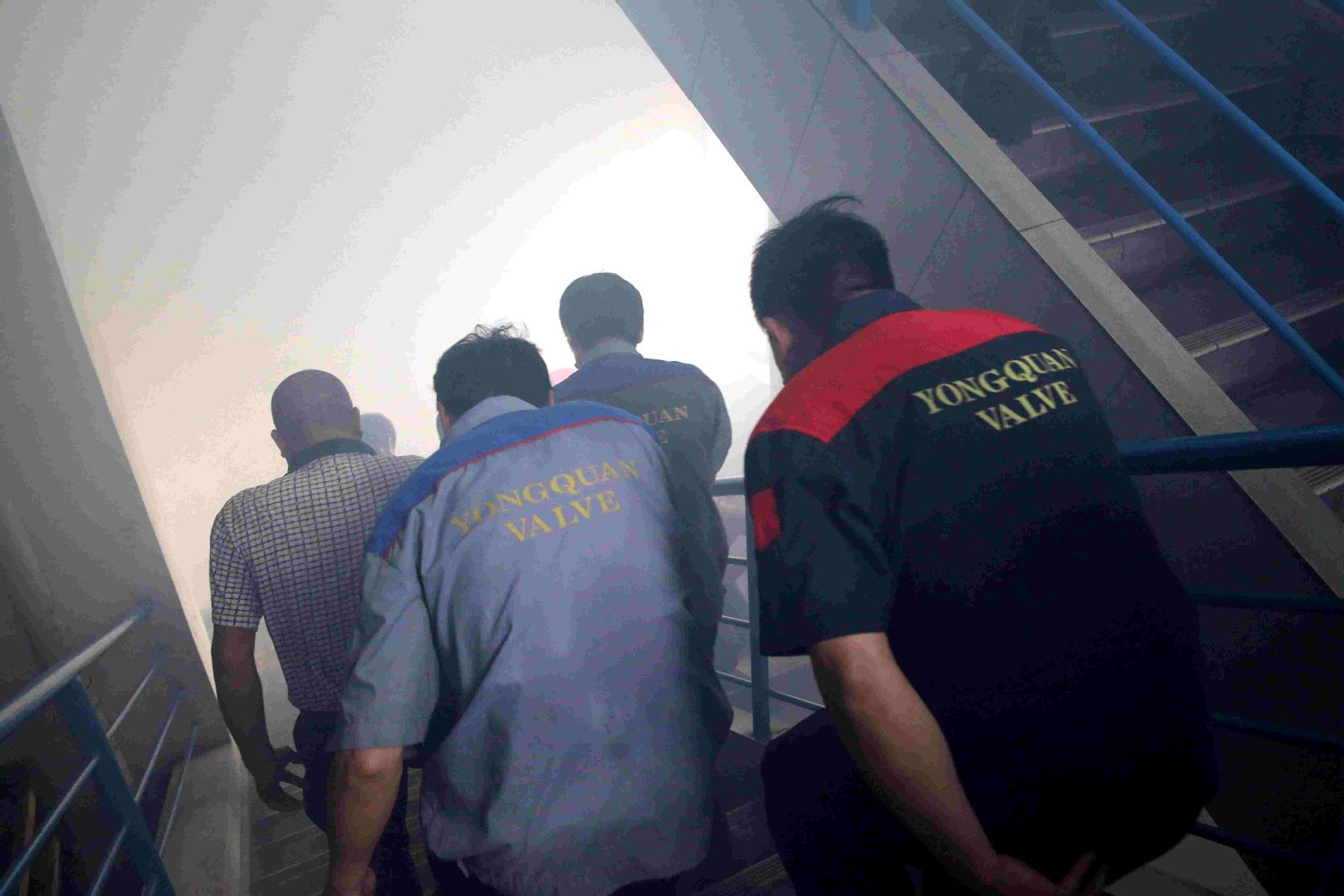 抽查結束后,組織參與員工到辦公室二樓集中,由演習器材準備組在辦公室一樓通道點燃了濃濃煙霧,安全生產負責人李福章急促不斷地吹著哨子,56名員工按照演練的要求彎著腰捂著鼻子有序地從二樓奔向一樓,在滾滾的濃濃的煙霧中演練著逃生。